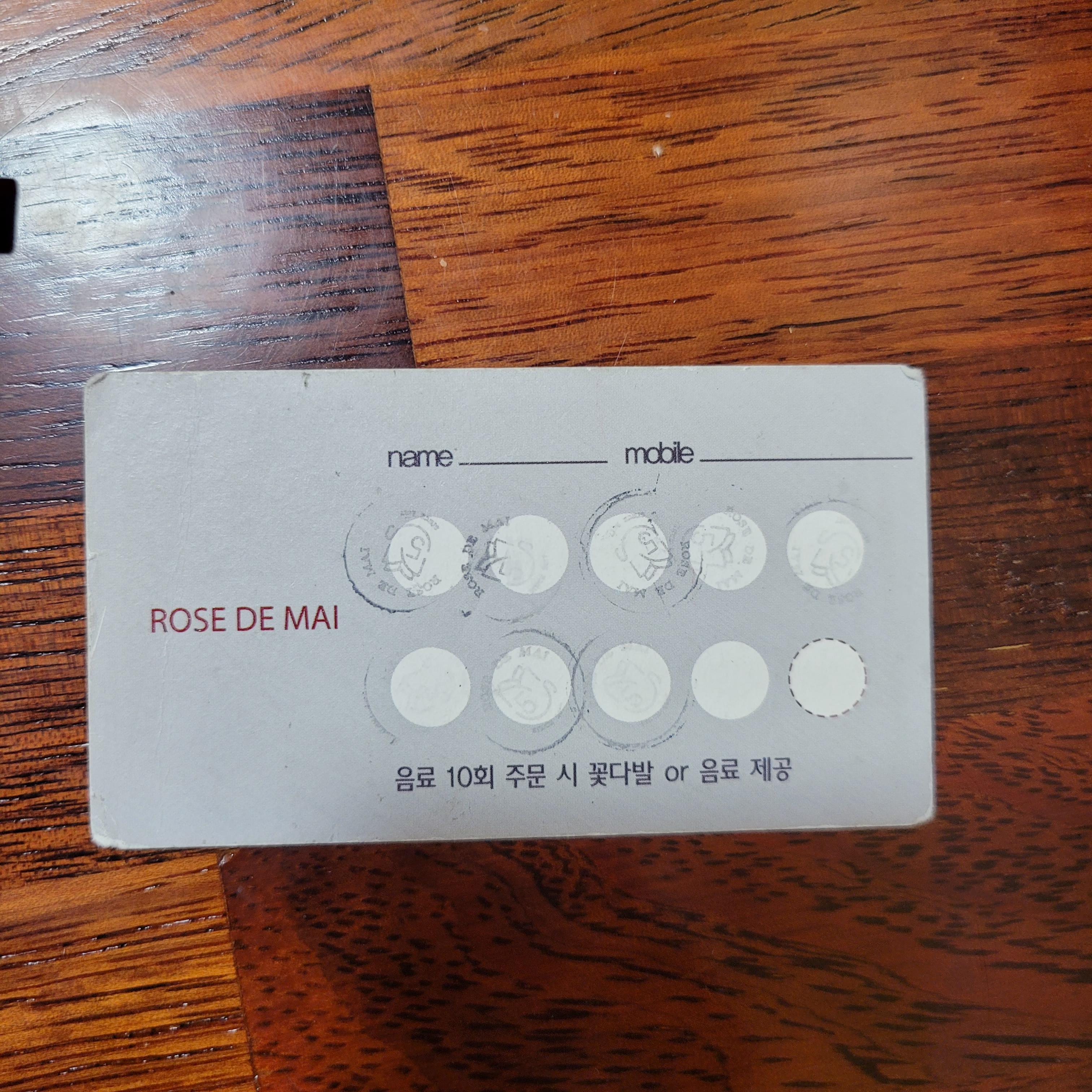 로즈드마이는 음료 주문시 스템프 적립을 할 수 있습니다. 10장 찍으면 꽃 혹은 커피 한 잔을 받을 수 있네요.